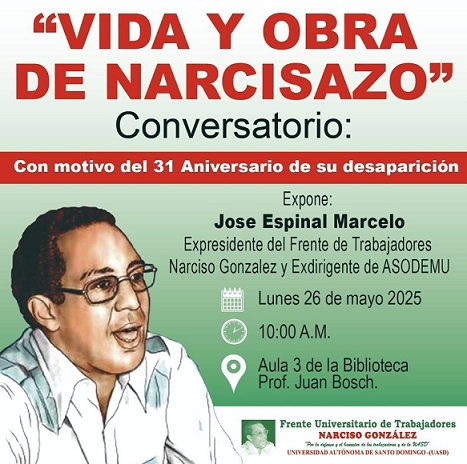 Santo Domingo. – Con motivo del 31 aniversario de la desaparición del destacado luchador social y catedrático universitario Narciso González (Narcisazo), el Frente Universitario de Trabajadores que lleva su nombre realizará un conversatorio titulado “Vida y Obra de Narcisazo”, en el que se abordará el pensamiento, la trayectoria política y el compromiso social del intelectual desaparecido.