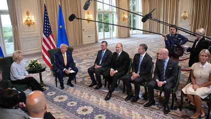 El acuerdo, concretado el domingo durante una reunión entre Trump y la presidenta de la Comisión Europea, Ursula von der Leyen, impone un arancel del 15 % a la mayoría de las exportaciones de la UE a Estados Unidos. Además, Bruselas se comprometió a invertir 600 000 millones de dólares en la economía estadounidense y a comprar energía estadounidense por valor de 750 000 millones de dólares en tres años. No se impusieron aranceles recíprocos a los productos estadounidenses.